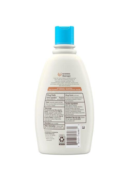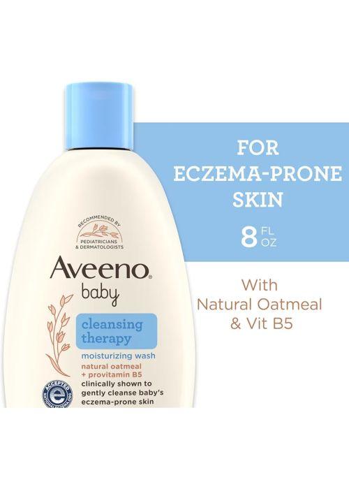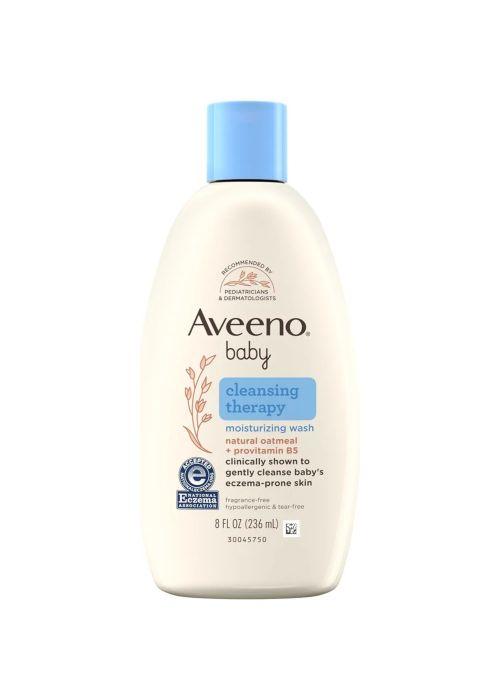 8-ounce bottle of Aveeno Baby Cleansing Therapy Moisturizing Baby Body Wash with natural oatmeal and provitamin B5 Moisturizing baby wash cleanses and soothes baby's irritated, dry, sensitive, and eczema prone skin, leaving it feeling comfortable Baby body wash is formulated with natural oatmeal which is known for its soothing & nourishing properties along with provitamin B5 and rich emollients The proprietary formula of this moisturizing baby wash has been pediatrician and dermatologist tested and comes from a pediatrician & dermatologist recommended brand This gentle baby wash is great for baby's sensitive skin and eczema-prone skin. It is ph-balanced, hypoallergenic, tear-free, and free of sulfates, soap, fragrances, parabens, phthalates, and phenoxyethanol