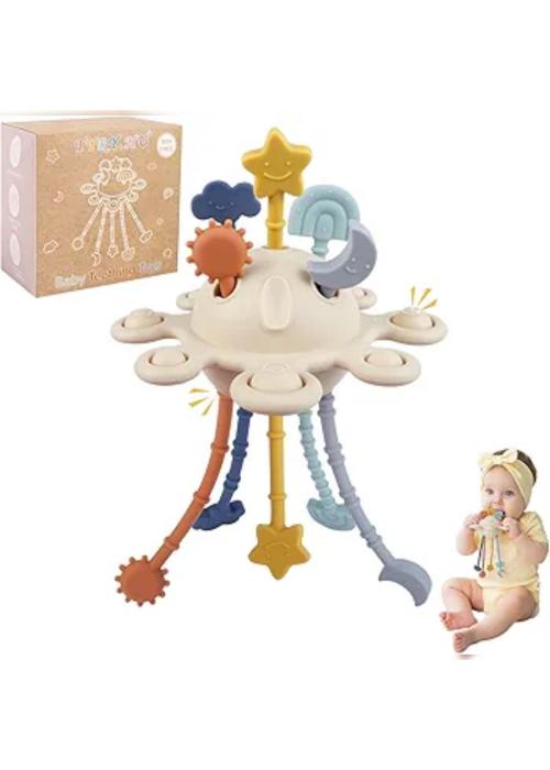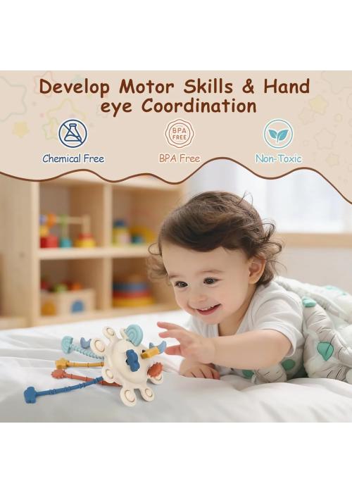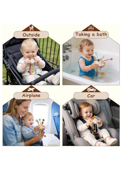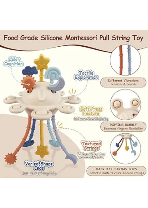 Healthy and Safe Material: Reliable sensory montessori toys suit for baby boys gilrs. Made of food grade silicone,Non-Toxic, BPA free. No pvc, Cadmium, Lead, Phthalates or Metals. Smooth Edge. No Weird Chemical Smell Montessori Sensory Toy for Fine Motor Skills: This Montessori-inspired toy is designed for babies 18+ months old. It offers a rich sensory experience with pullable ropes of varying shapes and textures, along with a soft, pressable button Good for Baby Early Development: Includes 5 textured silicone strings and 8 poppits on the back. Come with different colors and textures. As babies pull, press, they are actively engaging their cognitive skills and exploring their world. These activities help toddlers develop fine motor skills, strengthen hand-eye coordination, and improve their grasping ability. The diverse play options also stimulate your baby’s curiosity and encourage them to explore cause and effect Best Travel Companion for Toddlers: Lightweight and portable, this travel toy is the perfect solution for keeping your baby entertained on the go. It easily fits into a diaper bag, making it a life saver during car rides, plane trips, or stroller outings. It helps soothe fussy babies and gives parents a much-needed moment of peace. Beyond being a pull-string toy, it can also be used as a bath toy, offering even more ways to play Easy to Clean and Freezable: Dishwasher safe, freezer safe, microwave safe and steam santizer safe. Using steam or boiling water to clean the freezer teethers for babies before using. Easy to freeze, help the baby spend the teething period comfortably